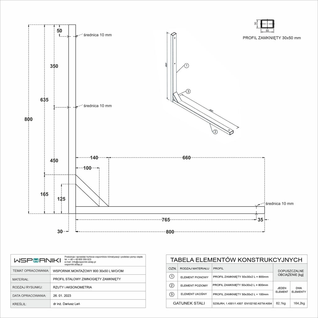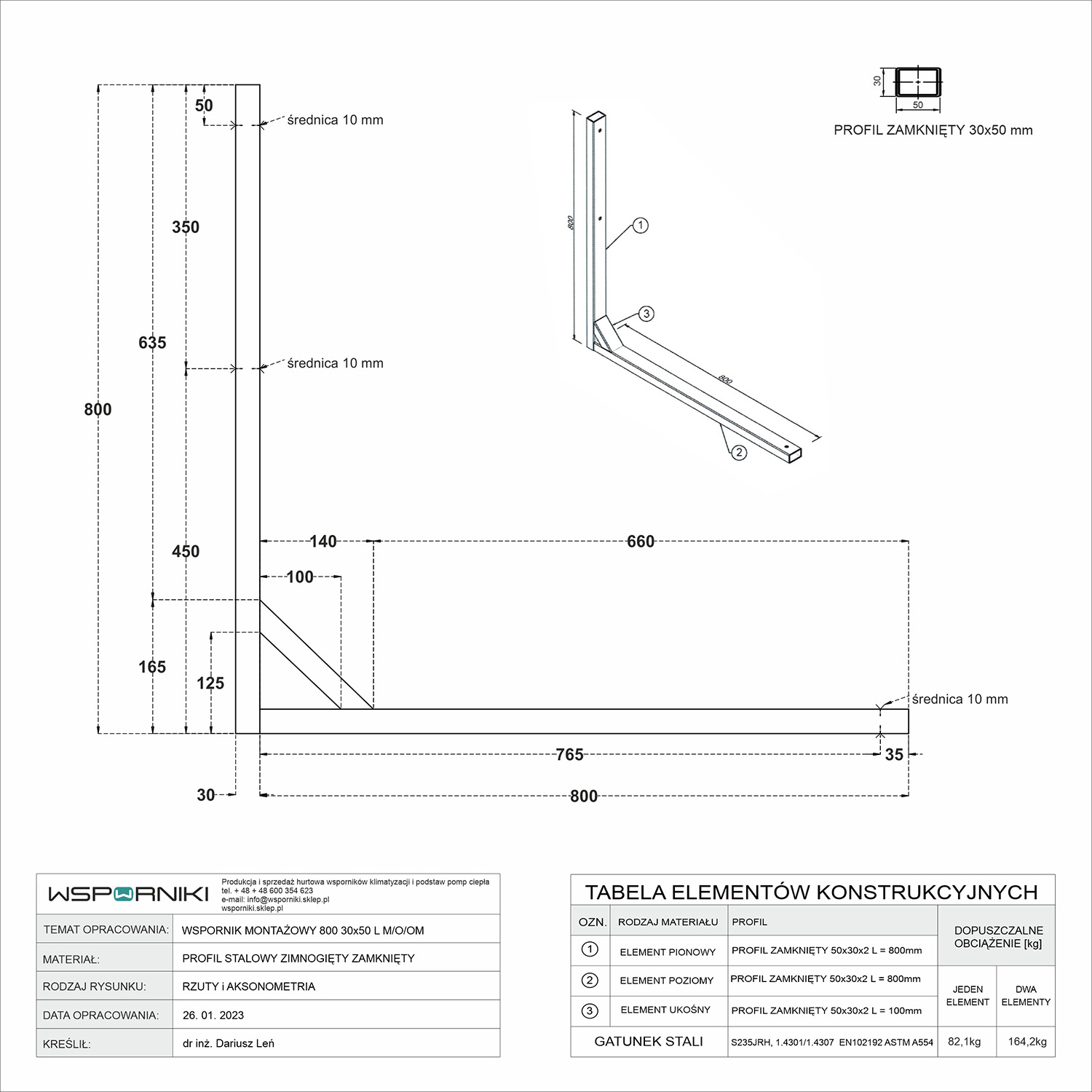 Wspornik jest zespawany z kształtowników stalowych o profilu zamkniętym. Kształtowniki wykonane są ze stali S235JR, która jest wykonywana zgodnie z normą EN 10025-2. Wsporniki spawane są metodą MIG i TIG.