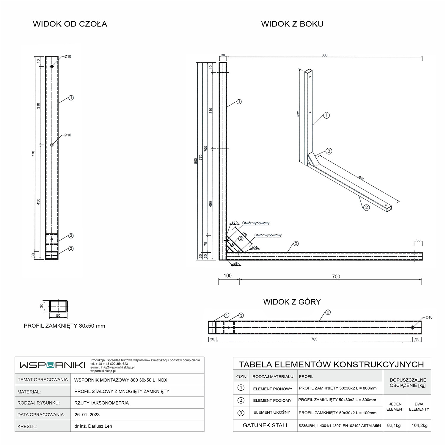 Wspornik jest zespawany z kształtowników stalowych o profilu zamkniętym. Kształtowniki wykonane są ze stali chromoniklowej INOX 1.4307. Wsporniki spawane są metodą MIG i TIG.