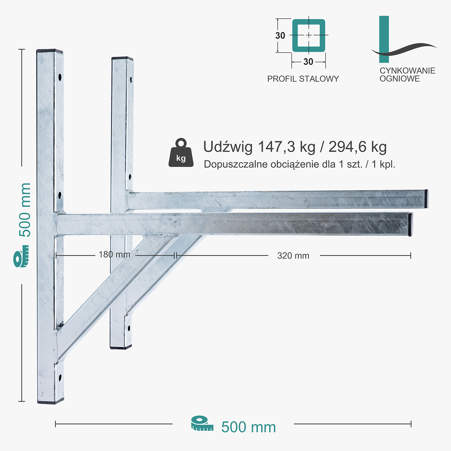 Dzięki temu, że oba wsporniki montuje się na ścianie niezależnie od siebie, na wsporniku można zainstalować urządzenie zewnętrzne o dowolnej szerokości, mając na uwadze, że maksymalne obciążenie dla 1 sztuki wynosi – 147,3 kg, a dla dwóch sztuk (kompletu) – 294,6 kg.