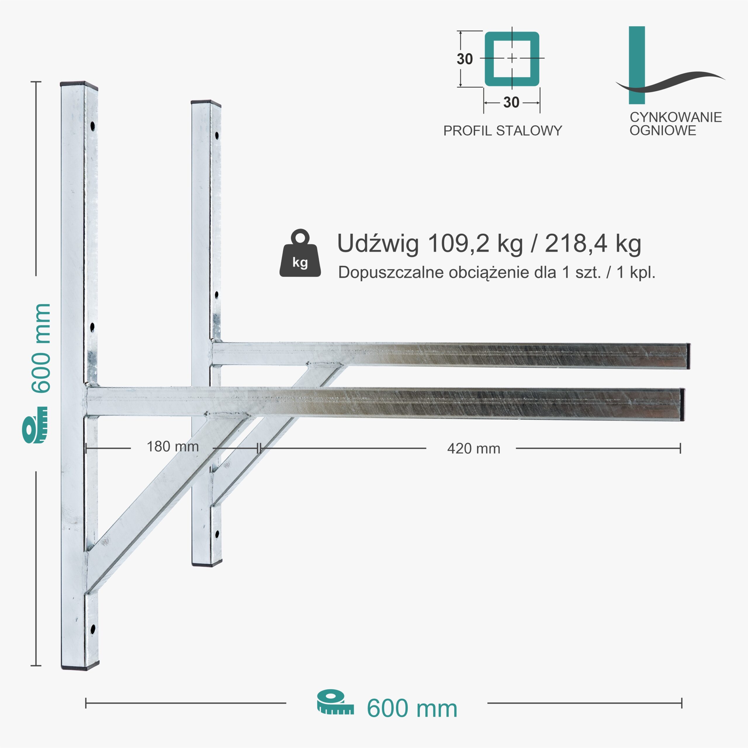 Cynkowanie ogniowe nadaje bardzo wysoką odporność na korozję i uszkodzenia mechaniczne. Wspornik ocynkowany praktycznie nie rdzewieje, dlatego daje trwałą gwarancję wytrzymałości i bezpieczeństwa użytkowania.
