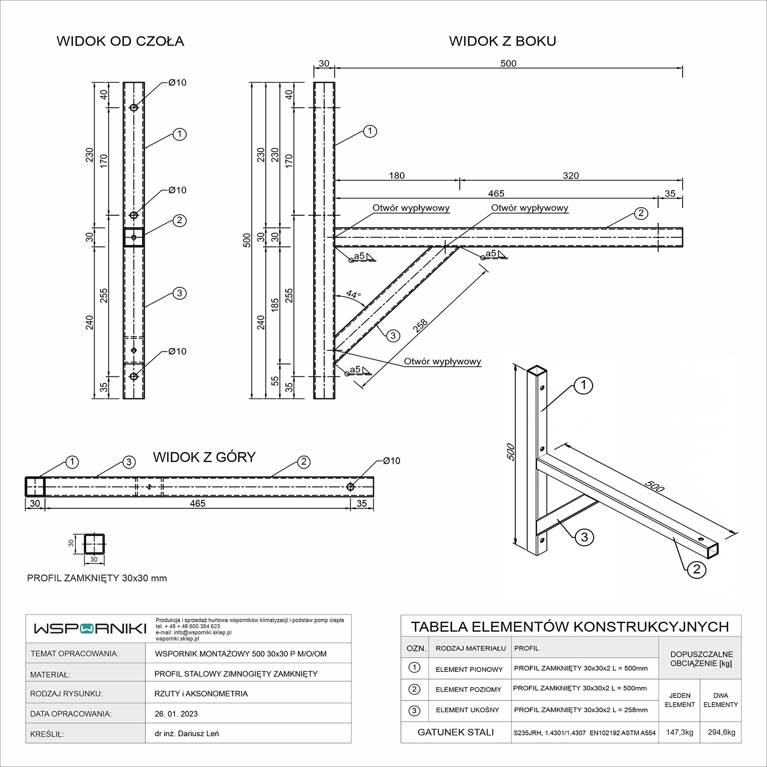 Wspornik jest zespawany z kształtowników stalowych o profilu zamkniętym. Kształtowniki wykonane są ze stali S235JR, która jest wykonywana zgodnie z normą EN 10025-2. Wsporniki spawane są metodą MIG i TIG.